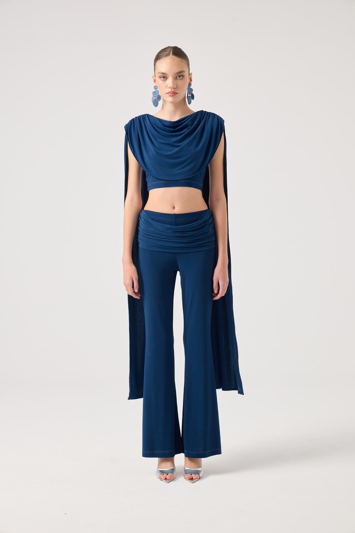 Yakası Şal Detaylı Fermuar Kapamalı Crop Bluz ve Beli Kıvırmalı ve Büzgülü İspanyol Paça Pantolon İkili Takım.